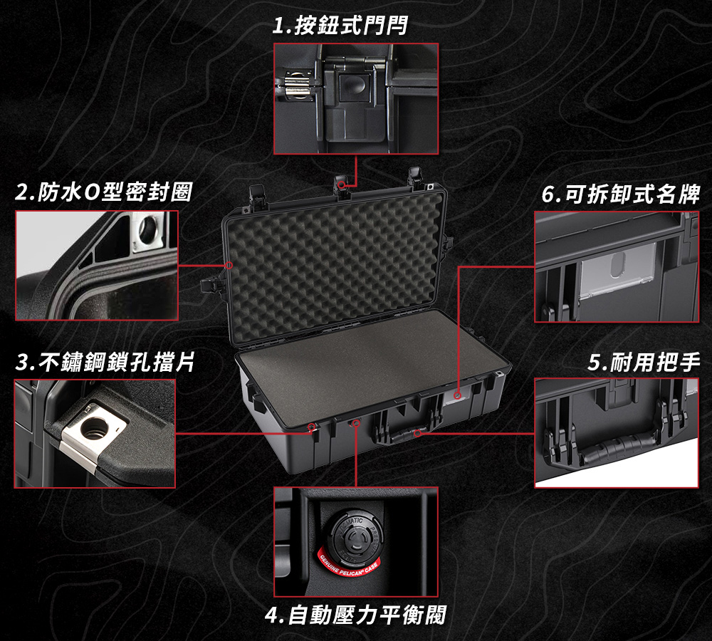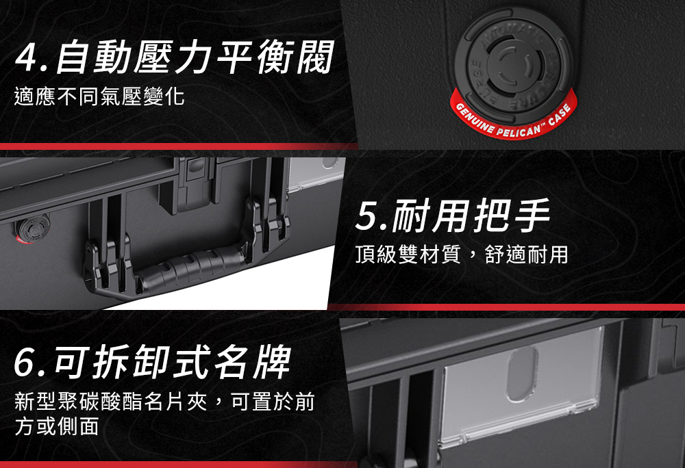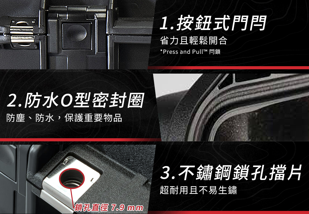 ● 輕量40%的全新科技 ● 經過IP67 和 MIL-SPEC 認證 ● Press and Pull™ 按鈕式門閂,省力且輕鬆開合 ● 不鏽鋼鎖孔擋片,超耐用且不易生鏽 ● 防水O型密封圈,防塵、防水 ● 頂級雙材質,耐用把手 ● 自動壓力平衡閥,適應不同氣壓變化 ● 可拆卸式名牌