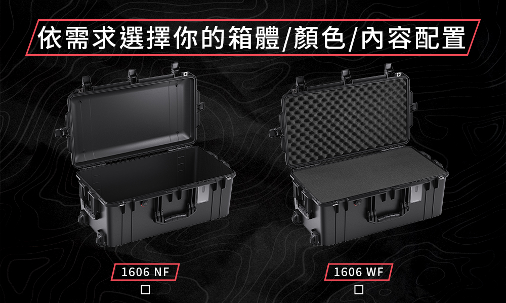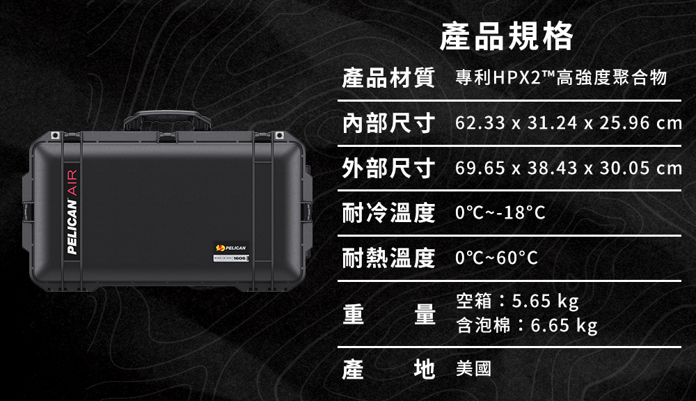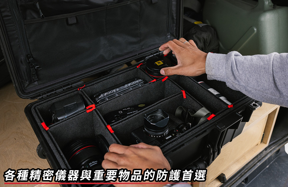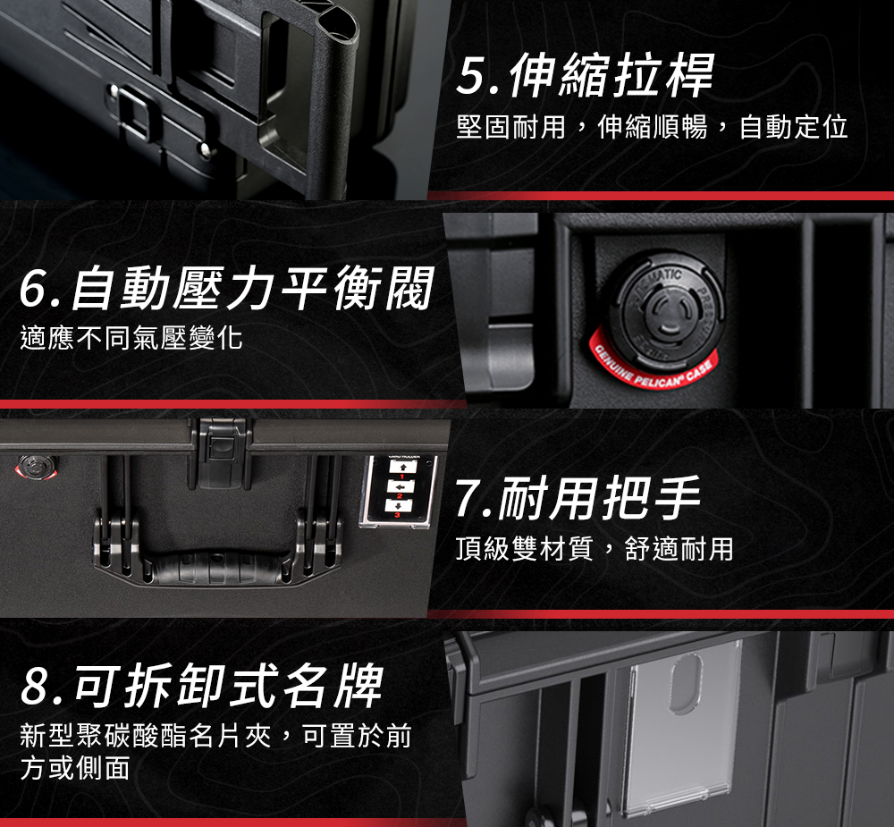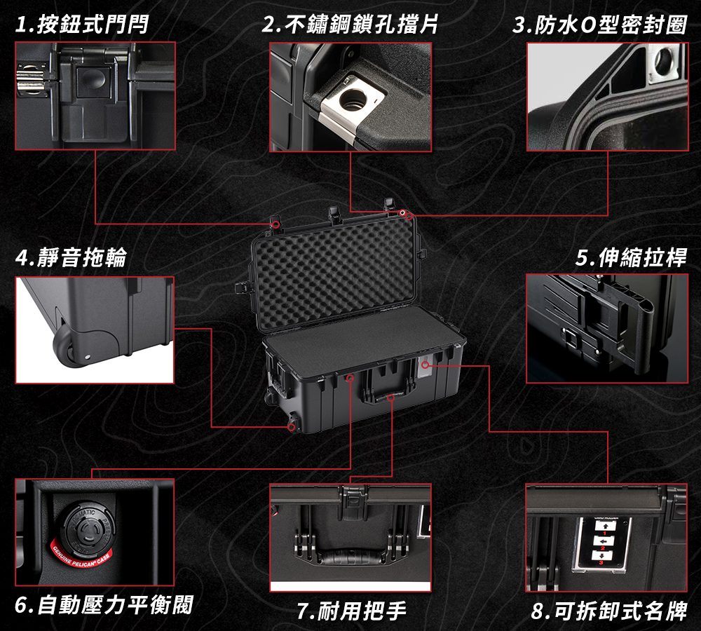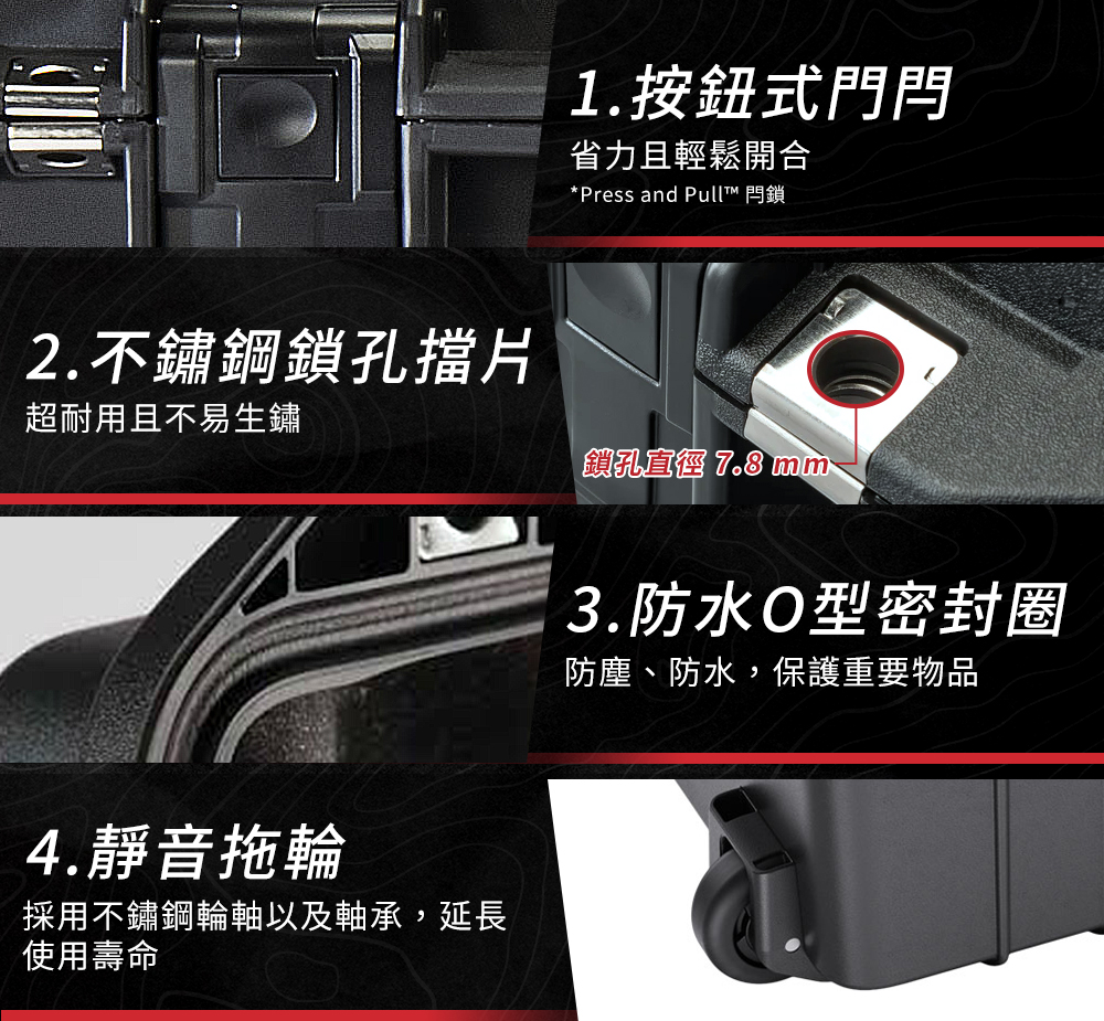 ● 輕量40%的全新科技 ● 經過IP67 和 MIL-SPEC 認證 ● Press and Pull™ 按鈕式門閂,省力且輕鬆開合 ● 不鏽鋼鎖孔擋片,超耐用且不易生鏽 ● 防水O型密封圈,防塵、防水 ● 頂級雙材質,耐用把手 ● 自動壓力平衡閥,適應不同氣壓變化 ● 可拆卸式名牌 ● 超耐用拖輪、伸縮拉桿