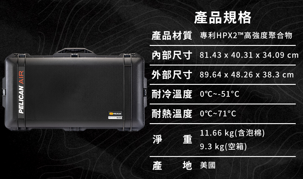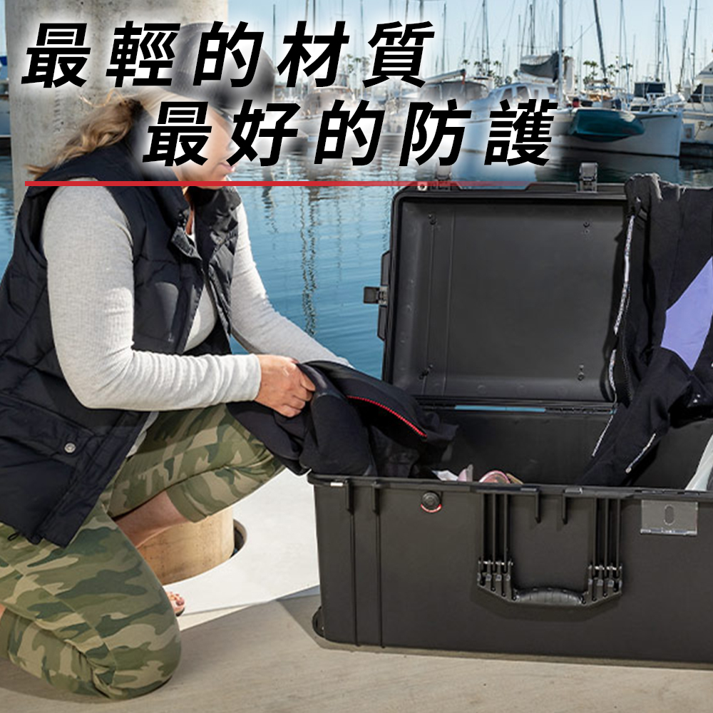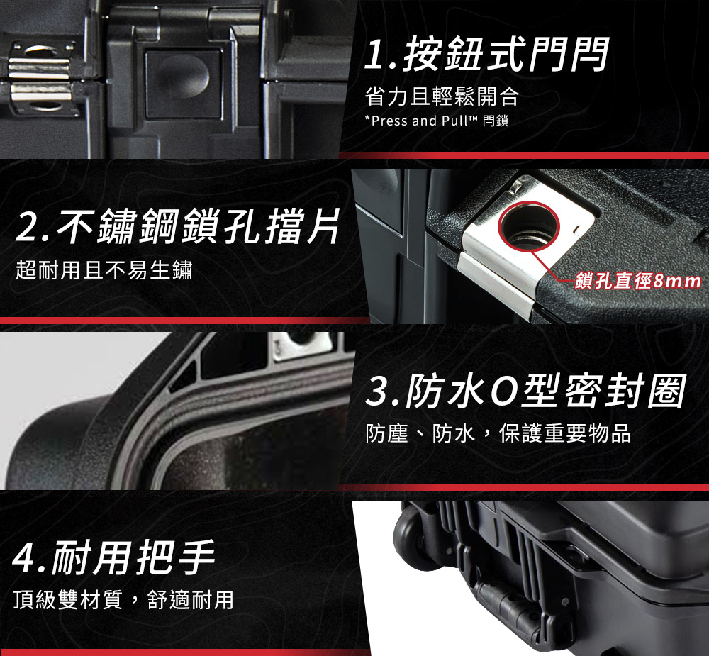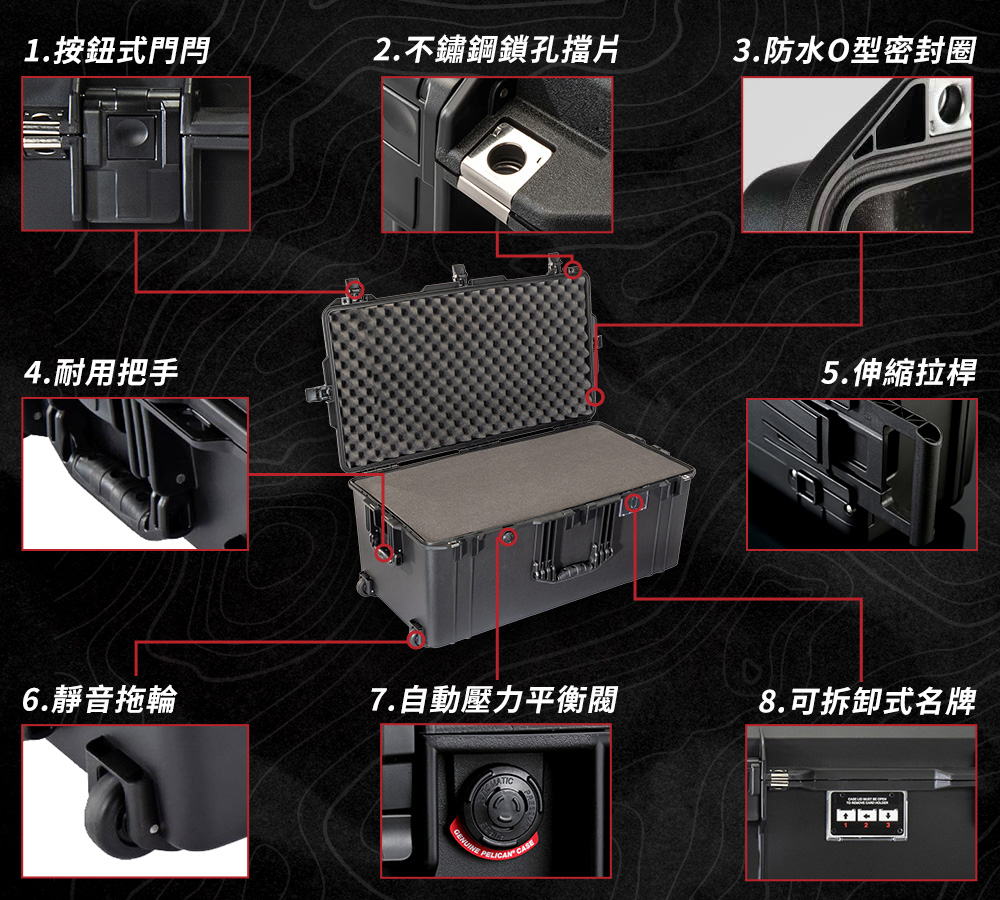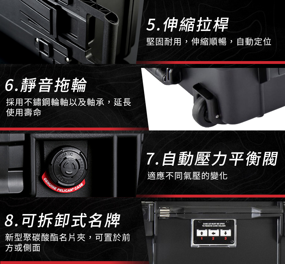 ● 輕量40%的全新科技 ● 經過IP67 和 MIL-SPEC 認證 ● Press and Pull™ 按鈕式門閂,省力且輕鬆開合 ● 不鏽鋼鎖孔擋片,超耐用且不易生鏽 ● 防水O型密封圈,防塵、防水 ● 頂級雙材質,耐用把手 ● 自動壓力平衡閥,適應不同氣壓變化 ● 可拆卸式名牌 ● 超耐用拖輪、伸縮拉桿
