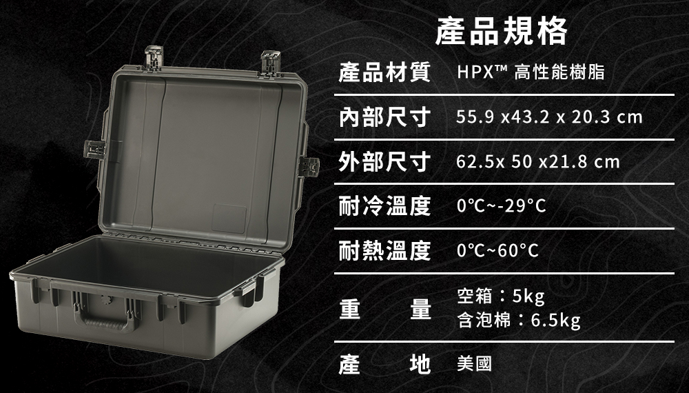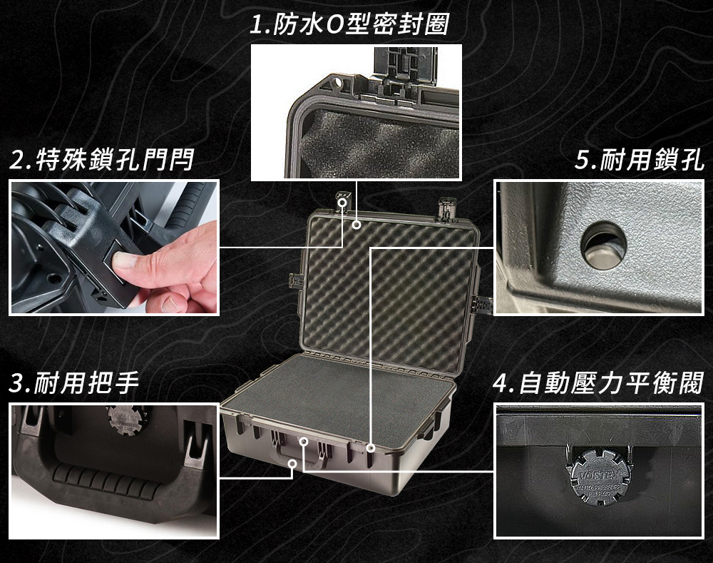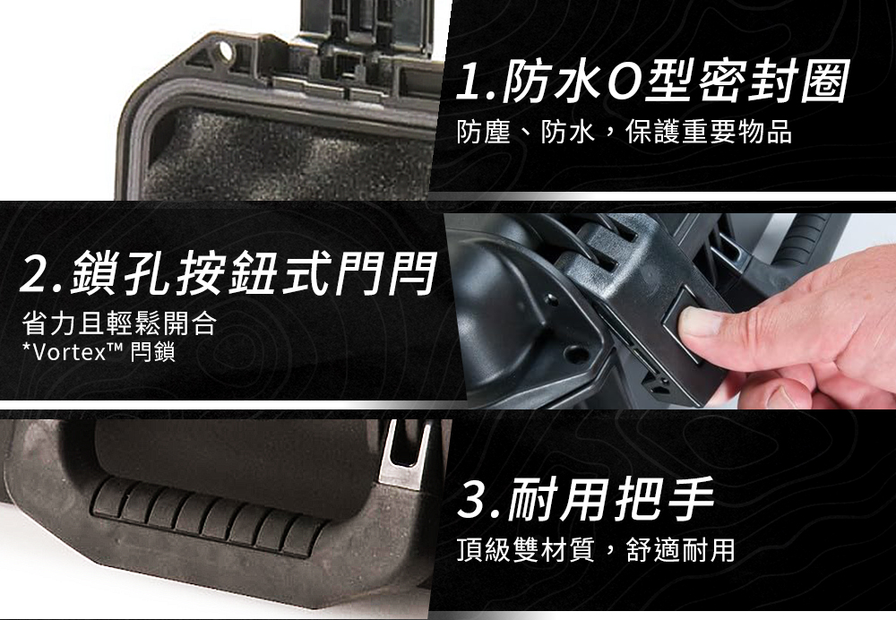 ● 經過 IP67 、 MIL-STD-810G認證 ● 軍規等級防護 最好的保護 ● 防水O型密封圈,防塵、防水 ● 按鈕式門閂,省力且輕鬆開合 ● 帶鎖耐用鎖孔,耐磨抗損 ● 自動壓力平衡閥,適應不同氣壓變化 ● 頂級雙材質,耐用把手